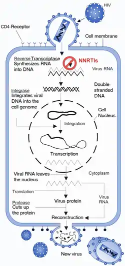 - 1 2 Sluis-Cremer N, Tachedjian G (June 2008). "Mechanisms of inhibition of HIV replication by non-nucleoside reverse transcriptase inhibitors". Virus Research. 134 (1–2): 147–56. doi:10.1016/j.virusres.2008.01.002. PMC 2745993. PMID 18372072.