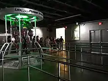 Guests enter the Lexcorp headquarters, the lair of Lex Luthor. Inside, there are posters advertising Luthor's different corporations such as LexAir, LexPower, Lexcom, and Lexcorp. One wall features blueprints for Lexcorp weapons. One wall features a picture of Lex and the company goal. At the far end is a fake elevator and Lex Luthor's Power suit, his weapon for fighting Superman. From time to time Lex can be heard welcoming guests and thanking them for volunteering to test his newest project. These recordings often feature ominous sayings to tell the guests that something is wrong. Guests then move through a secure access hallway, passing company mottos and offices. This hallway even has a door labeled Research & Development, which is the Flash Pass entrance. Heading outside, guests walk down a short pathway before reaching the loading area.[17] The ride has a single rider line, which is located near the exit. Guests will stand in front of the chain and wait for the ride operator to direct them to the next available seat.[18]