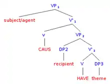 As seen in the underlying tree structure for (3a), the silent subunit BECOME is embedded within the Verb Phrase (VP), resulting in the inchoative change-of-state meaning (y become z). In the underlying tree structure for (3b), the silent subunits CAUS and BECOME are both embedded within the VP, resulting in the causative change-of-state meaning (x cause y become z).[12]