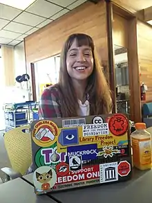 The director of the Library Freedom Project, Alison Macrina, at unBound, the technology lab and maker space of the Meridian Library District in Idaho, shortly after giving a privacy workshop in January 2016. The logos are those of assorted privacy enhancing technologies, institutions and advocacy groups such as the Tor project, the Electronic Freedom Foundation, Privacy Badger and Noisebridge