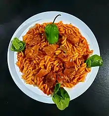 The cuisine of Libya is Arab and Mediterranean with Ottoman and Italian influence.[1] One of the most popular Libyan dishes is bazin, an unleavened bread prepared with barley, water and salt.[2] Bazin is prepared by boiling barley flour in water and then beating it to create a dough using a magraf, which is a unique stick designed for this purpose.[3]