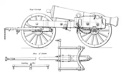 Siege artillery limbers, unlike field artillery limbers, did not have an ammunition chest. Siege artillery limbers resembled their predecessors: they were two-wheeled carts with a pintle, now somewhat behind the axle. When the piece was to be hauled, the trail was raised above the limber, then lowered, with the pintle fitting into a hole in the trail. Unlike the situation with its predecessors, horses were harnessed to the 19th-century limber in pairs, with six to ten horses needed to haul a siege gun or howitzer.[8]
