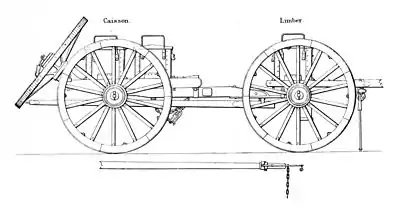 As artillery pieces developed trunnions and were placed on carriages featuring two wheels and a trail, a limber was devised. This was a simple cart with a pintle. When the piece was to be towed, it was raised over the limber and then lowered, with the pintle fitting into a hole in the trail. Horses or other draft animals were harnessed in single file to haul the limber.[4] There was no provision for carrying ammunition on the limber, but an ammunition chest was often carried between the two pieces of the trail.[5]
