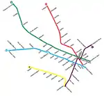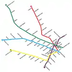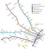 The line was further extended in 1973 to José María Moreno and then again in 1985 to Plaza de los Virreyes.[4] The PreMetro E2 tramway was completed in 1987 and was linked to Line E with the intention of connecting a larger Premetro network to the line, although this never materialised following privatisation.[5]