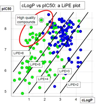 LiPE allows capturing both values in a single parameter, and empirical evidence suggest that quality drug candidates have a high LiPE (>6); this value corresponds to a compound with a pIC50 of 8 and a LogP of 2. Plotting LogP against pIC50 for a range of compounds allows ranking series and individual compounds.
