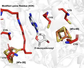 - ↑ Jarrett JT (February 2015). "The biosynthesis of thiol- and thioether-containing cofactors and secondary metabolites catalyzed by radical S-adenosylmethionine enzymes". The Journal of Biological Chemistry. 290 (7): 3972–9. doi:10.1074/jbc.R114.599308. PMC 4326807. PMID 25477512.