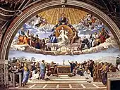 The following is a list of paintings by Italian Renaissance painter Raphael. Together with Michelangelo and Leonardo da Vinci he forms the traditional trinity of great masters of that period. He was enormously prolific, despite his early death at 37, and a large body of work remains, especially in the Vatican, where Raphael and a large team of assistants, executing his drawings under his direction, frescoed the Raphael Rooms known as the Stanze. He was extremely influential in his lifetime, but after his death the influence of his rival Michelangelo was more widespread until the 18th and 19th centuries, when his more tranquil qualities were again widely taken as models.