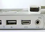 Male Mini-DVI plug on top of a 12-inch PowerBook G4; female port is second from left.