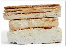 One of the advantages about using mycelium based composites is that properties can be altered depending on fabrication process and the use of different fungus. Properties depend on type of fungus used and where they are grown.[40] Additionally, fungi has an ability to degrade the cellulose component of the plant to make composites in a preferable manner.[3] Some important mechanical properties such as compressive strength, morphology, tensile strength, hydrophobicity, and flexural strength can be modified as well for different use of the composite.[40] To increase the tensile strength, the composite can go through heat pressing.[38] The properties of a mycelium composite are affected by its substrate; for example, a mycelium composite made out of 75 wt% rice hulls has a density of 193 kg/m3, while 75 wt% wheat grains has 359 kg/m3.[3] Another method to increase the density of the composite would be by deleting a hydrophobin gene.[40] These composites also have the ability of self-fusion which increases their strength.[40] Mycelium based composites are usually compact, porous, lightweight and a good insulator. The main property of these composites is that they are entirely natural, therefore sustainable. Another advantage of mycelium based composites is that this substance acts as an insulator, is fireproof, nontoxic, water-resistant, rapidly growing, and able to bond with neighboring mycelium products.[42] Mycelium-based foams (MBFs) and sandwich components are two common types of composite.[3] MBFs are the most efficient type because of their low density property, high quality, and sustainability.[37] The density of MBFs can be decreased by using substrates that are smaller than 2mm in diameter.[37] These composites have higher thermal conductivity as well.[37]