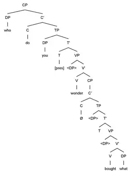 In wh-movement in English, an interrogative sentence is formed by moving the wh-word (determiner phrase, preposition phrase, or adverb phrase) to the specifier position of the complementizer phrase. This results in the movement of the wh-phrase into the initial position of the clause.[1] This is seen in English word order of questions, which show Wh components as sentence initial, though in the underlying structure, this is not so.