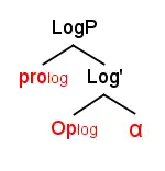 Adapted from Charnavel (2020), illustrating the structure of the LogP projection of the logophoric operator, where it's complement 'α' contains the exempt anaphor which the silent logophoric pronoun binds. The LogP projection would appear in the left periphery of the exempt anaphors domain.