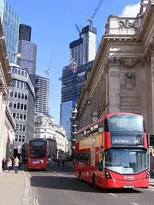 In 2017, the route was diverted to terminate at St Paul's, before being cut back on 15 June 2019 to Aldgate bus station with a service frequency reduction.[7] The diversion to Aldgate was criticised for the reduction in access to the City of London and St Bartholomew's Hospital for residents.[8][9] The reduction in service frequency was criticised for its impacts on the deprived Clapton Park Estate, an area only served by the route.[10][11]