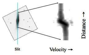 Long-slit spectroscopy can also be used to observe the expansion of optically-thin nebulae. When the spectrographic slit extends over the diameter of a nebula, the lines of the velocity profile meet at the edges. In the middle of the nebula, the line splits in two, since one component is redshifted and one is blueshifted. The blueshifted component will appear brighter as it is on the "near side" of the nebula, and is as such subject to a smaller degree of attenuation as the light coming from the far side of the nebula. The tapered edges of the velocity profile stem from the fact that the material at the edge of the nebula is moving perpendicular to the line of sight and so its line of sight velocity will be zero relative to the rest of the nebula.[3]