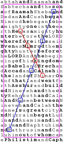 Equidistant letter sequences "wiki" and "Pedia" found in the King James Version of Genesis (10:7-14)