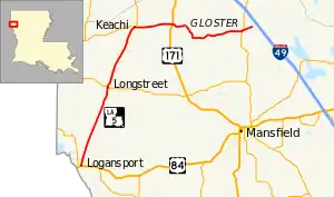 An almost entirely rural route, LA 5 is located between the Texas state line and Interstate 49 (I-49) south of Shreveport in the northwest portion of the state. It begins in Logansport as a north–south route and is signed accordingly. In Keatchi, its direction and signage switches to east–west. Shortly afterward, LA 5 crosses US 171 in Gloster.