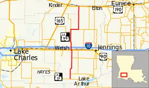 The highway bisects the sparsely populated Jefferson Davis Parish as it zigzags along rural section line roads. Roughly halfway along its route, LA 99 passes through the town of Welsh and an interchange with Interstate 10 (I-10), the region's main east–west highway. It also intersects US 90, an older parallel corridor that now acts largely as a business route in the area.