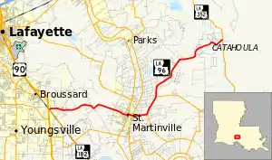 From the west, LA 96 begins at an intersection with LA 182 (Old Spanish Trail) in an area within the Broussard city limits known as Billeaud. This intersection is located about 300 feet (91 m) from an interchange with US 90, connecting with the larger adjacent city of Lafayette as well as New Iberia. LA 96 heads east on Terrace Highway and initially passes a few small industrial establishments before entering an area of light suburban development. After one mile (1.6 km), the highway crosses from Lafayette Parish into St. Martin Parish. Soon afterward, LA 96 crosses over a small coulee as the surroundings become rural. The route makes a sharp dip to the south before proceeding in a southeast direction into the small city of St. Martinville.[2][3][4][5]