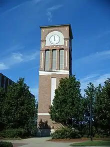 Another popular location on the Main Campus is Centennial Plaza. In 1994, Centennial Plaza was constructed to commemorate the 100th anniversary of Louisiana Tech's founding. The plaza was funded by a student self-assessed fee and designed specifically for the use and enjoyment of the student body. Centennial Plaza is used for special events throughout the year, such as Christmas in the Plaza, movie events, and student organizational fairs. Centennial Plaza is one of the main gathering points of the students due to the plaza's close proximity to the on-campus restaurants, coffee shops, dining halls, university post office, and offices for Student Life, SGA, and Union Board. At the center of the plaza is the Clock Tower which has the sound and digital capabilities to play the Alma Mater, Fight Song, and any other songs and calls as needed. The Alumni Brick Walkway runs through Centennial Plaza and around the Clock Tower.[27] A large Louisiana Tech seal marks the middle of Centennial Plaza just west of the Clock Tower. Centennial Plaza is enclosed by Tolliver Hall, the Student Center, Howard Auditorium, and Harper Residence Hall.