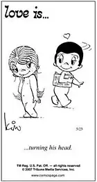 Love Is... is a comic strip created by New Zealand cartoonist Kim Casali (née Grove) in the 1960s.[1][2] The cartoons originated from a series of love notes that Grove drew for her future husband, Roberto Casali. They were published in booklets[2] in the late 1960s before appearing in strip form in a newspaper in 1970, under the pen name "Kim". They were syndicated soon after and the strip is syndicated worldwide today by Tribune Content Agency.[1] One of her most famous drawings, "Love Is...being able to say you are sorry", published on February 9, 1972, was marketed internationally for many years in print, on cards and on souvenirs. The beginning of the strip coincided closely with the 1970 film Love Story. The film's signature line is "Love means never having to say you're sorry." At the height of their popularity in the early to mid 1970s, the cartoons were earning Casali around five to six million dollars annually.[3]