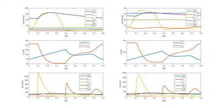 with the final time. The first two equations are related to the volumes in the left atrium and ventricles respectively. The equations from the third to the sixth are related to the pressures, and fluxes of the systemic arterial and venous systems. The last equations are related to the right heart and the pulmonary circulation in an analogous way. The system is completed with initial conditions for each of the unknowns.[5]