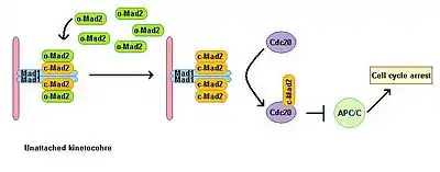 Eukaryotic cells show a mitotic arrest in the presence of microtubule polymerization inhibitors. A spindle assembly checkpoint monitors the status of the spindle and links the metaphase-anaphase transition to proper bipolar attachment of all kinetochores to the mitotic spindle. The spindle assembly checkpoint inhibits the activity of the anaphase promoting complex by preventing degradation of downstream effectors, which otherwise lead to anaphase onset and exit from mitosis. Depletion of Mad1 leads to the loss of SAC function. Mad1 localises predominantly at unattached kinetochores and triggers mitotic arrest in case of a single unattached kinetochore. Mad1 recruits the important SAC component Mad2 to unattached kinetochores and induces mitotic arrest signal amplification. There is a pool of free cytoplasmic Mad2 in its inactive open conformation called o-MAD2. When bound to Mad1, Mad2 adopts an active conformation called closed (c-Mad2) and forms a heterotetramer of two Mad1 and two c-Mad2 units. The heterotetramer of Mad1–c-Mad2 is very stable and works as a catalytic receptor for free cytoplasmic o-Mad2. Free o-Mad2 binds to this receptor and changes its conformation to the active closed form. This second c-MAD2 is transferred to Cdc20 with yet unknown mechanism and forms Cdc20–c-Mad2 complex. This complex is an essential component of mitotic checkpoint complex (MCC). MCC binds and inhibits APC/C and therefore arrests progression through mitosis.[3][4]