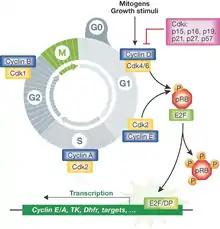 The ERK pathway plays an important role of integrating external signals from the presence of mitogens such as epidermal growth factor (EGF) into signaling events promoting cell growth and proliferation in many mammalian cell types. In a simplified model, the presence of mitogens and growth factors trigger the activation of canonical receptor tyrosine kinases such as EGFR leading to their dimerization and subsequent activation of the small GTPase Ras.[6] This then leads to a series of phosphorylation events downstream in the MAPK cascade (Raf-MEK-ERK) ultimately resulting in the phosphorylation and activation of ERK. The phosphorylation of ERK results in an activation of its kinase activity and leads to phosphorylation of its many downstream targets involved in regulation of cell proliferation. In most cells, some form of sustained ERK activity is required for cells to activate genes that induce cell cycle entry and suppress negative regulators of the cell cycle. Two such important targets include Cyclin D complexes with Cdk4 and Cdk6 (Cdk4/6) which are both phosphorylated by ERK.[7] The transition from G1 to S phase is coordinated by the activity of Cyclin D-Cdk4/6, which increases during late G1 phase as cells prepare to enter S-phase in response to mitogens. Cdk4/6 activation contributes to hyper-phosphorylation and the subsequent destabilization of retinoblastoma protein (Rb).[7] Hypo-phosphorylated Rb, is normally bound to transcription factor E2F in early G1 and inhibits its transcriptional activity, preventing expression of S-phase entry genes including Cyclin E, Cyclin A2 and Emi1.[6] ERK1/2 activation downstream of mitogen induced Ras signaling is necessary and sufficient to remove this cell cycle block and allow cells to progress to S-phase in most mammalian cells.