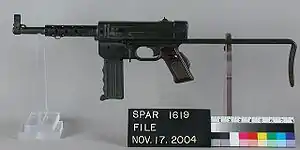 MAT-49 on display. This weapon has the front grip lowered in firing position, but lacks a magazine.