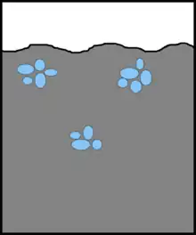 Creaming is the accumulation of drops in the dispersed phase at the top of the container.[2] This occurs as a result of buoyancy forces. The density of the dispersed and continuous phases, as well as the viscosity of the continuous phase, greatly affect the creaming process. If the dispersed phase liquid is less dense than the continuous phase liquid, creaming is more likely to occur. Also, there is a greater chance of creaming at lower viscosities of the continuous phase liquid. Once all of the dispersed drops are in close proximity to each other, it is easier for them to coalesce.