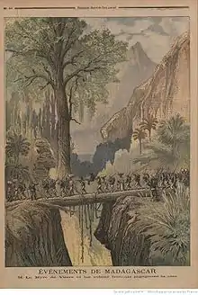 An expeditionary corps was sent under General Jacques Duchesne.[5] First, the harbor of Toamasina on the east coast, and Mahajanga on the west coast, were bombarded and occupied in December 1894 and January 1895 respectively.[6] Some troops were landed, but the main expeditionary force, however, arrived in May 1895, numbering about 15,000 men, supported by around 6,000 carriers.[7][8] The campaign was to take place during the rainy season, with disastrous consequences for the French expeditionary corps.[9]