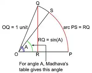Consider some angle whose measure is A. Consider a circle of unit radius and center O. Let the arc PQ of the circle subtend an angle A at the center O. Drop the perpendicular QR from Q to OP; then the length of the line segment RQ is the value of the trigonometric sine of the angle A. Let PS be an arc of the circle whose length is equal to the length of the segment RQ. For various angles A, Madhava's table gives the measures of the corresponding angles POS in arcminutes, arcseconds and sixtieths of an arcsecond.