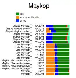 According to genetic studies on ancient DNA published in 2018, the Maykop population came from the south, from Imereti, and was descended from the Chalcolithic farmers known as Darkveti-Meshoko who first colonized the north side of the Caucasus. Maykop is therefore the "ideal archaeological candidate for the founders of the Northwest Caucasian language family".[2][3]