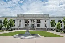 The original building was designed by Albert Randolph Ross of New York and Wilbur T. Mills of Columbus. It was built in a Beaux-Arts style (sometimes referred to as Second Renaissance Revival-style[9]), using white Vermont marble on a gray granite base.[2] It has two stories and a basement.[8] The west facade is lively with arches, columns, friezes, and carved cherubs. A large frieze reads "Biblioteca Fons Eruditionis", or "the library, the fount of learning".[2] A smaller frieze over the central entranceway reads "Open to all" in bold capital letters (Carnegie required that anyone use the libraries he funded).[20] The facade also features a row of benches, with the inscription "my treasures are within" across them; this phrase was suggested to be used by Carnegie, in his letter awarding his funds. Friezes atop windows on the west facade mention the classical poets Virgil and Homer; other inscriptions credit Carnegie for funding the library and another has the Latin word "anno" followed by Roman numerals "MCMIV", meaning "the year 1904", when the cornerstone was laid.[23]