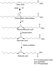 - ↑ Hooper, N. K.; Law, J. H. (1965). "Biosynthesis of cyclopropane compounds VII. Synthesis of cyclopropane and cyclopropene fatty acids by seedlings". Biochemical and Biophysical Research Communications. 18 (3): 426–9. doi:10.1016/0006-291X(65)90725-4. PMID 14300760.