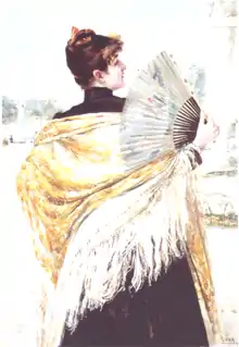 The Manila shawl (Spanish: mantón de Manila or mantón de seda) is an embroidered silk shawl derived from the Filipino pañuelo. They were popular in the Philippines, Latin America, and Spain during the colonial era. It also became popular in European fashions in the 19th century. In modern times, it is still an aspect of various traditional clothing in Hispanic cultures and is particularly prominent as part of the costume (traje de flamenca) of flamenco dancers (bailaoras) and Gitana women.[1]