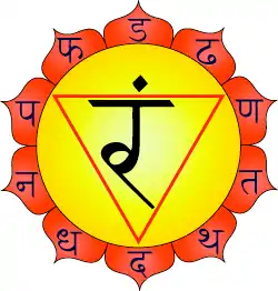 Located above the navel,[1] Manipura translates from Sanskrit as "city of jewels" alternatively translated as "resplendent gem" or "lustrous gem". Manipura is often associated with the colors yellow,[2] blue in classical tantra,[3] and red in the Nath tradition.