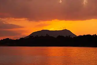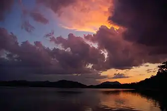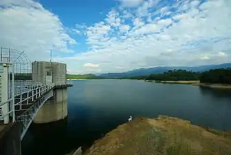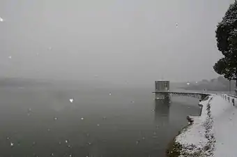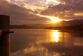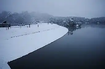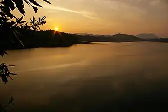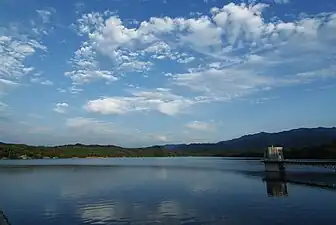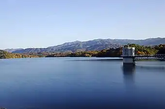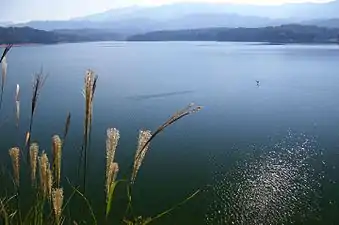 Mannō Lake (満濃池, Mannō Ike) is a man-made irrigation reservoir with a reserve capacity of 15.4 million tons, located in the town of Mannō, Kagawa, Japan, on the island of Shikoku. It is vaguely shaped like a human hand. Around the lake is a forest of Japanese red pine, sawtooth oak, and konara oak, and 75 species of birds, including goshawks and sparrowhawks, as well as 12 species of wild animals, including Japanese squirrels. Due to the importance of the habitat, 321 hectares has been designated as a wildlife sanctuary by Kagawa Prefecture .