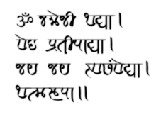 The earliest example of Maharashtri as a separate language dates to approximately 1st century BCE: a stone inscription found in a cave at Naneghat, Junnar in Pune district had been written in Maharashtri using Brahmi script.[13][14][15] A committee appointed by the Maharashtra State Government to get the Classical status for Marathi has claimed that Marathi existed at least 1,500 - 2,000 years ago alongside Sanskrit as a sister language.[16] Marathi, a derivative of Maharashtri Prakrit language, is probably first attested in a 739 CE copper-plate inscription found in Satara. Several inscriptions dated to the second half of the 11th century feature Marathi, which is usually appended to Sanskrit or Kannada in these inscriptions.[17] The earliest Marathi-only inscriptions are the ones issued during the Shilahara rule, including a c. 1012 CE stone inscription from Akshi taluka of Raigad district, and a 1060 or 1086 CE copper-plate inscription from Dive that records a land grant (agrahara) to a Brahmin.[18] A 2-line 1118 CE Marathi inscription at Shravanabelagola records a grant by the Hoysalas. These inscriptions suggest that Marathi was a standard written language by the 12th century. However, there is no record of any literature produced in Marathi until the late 13th century.[19]