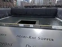 Sopper is memorialized at the National September 11 Memorial & Museum in Manhattan, New York City and the Pentagon Memorial in Arlington County, Virginia.[4] Her alma mater, Iowa State University, presents the "Mari-Rae Sopper Outstanding Performance Award" to a gymnastics athlete after each home meet.[7] A Judge Advocate General's Corps conference room within The Pentagon was also named after her.[4]