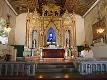 Maribojoc had five intricately carved Neo-Gothic retablos in the sanctuary and transepts.[8] Striking features of the retablo were the presence of arches, crockets, Mudéjar stars and the profusion of carving. The whole retablo was probably completed on January 7, 1934, as a project of the Comité de Obras during the term of Father Quiterio Sarigumba (P.Q.S.) as seen on the inscription in the upper reaches of the central retablo.[14] An older retablo, built from 1616 to 1692, predated the church.[5]