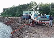Farmers transferring postlarvae from the tanks on the truck to a grow-out pond