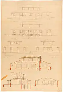 Wright understated the contributions of others of the Prairie School, Mahony included. A clear understanding of Marion Mahony's contribution to the architecture of the Oak Park Studio comes from Wright's son, John Lloyd Wright, who says that William Drummond, Francis Barry Byrne, Walter Burley Griffin, Albert Chase McArthur, Marion Mahony, Isabel Roberts and George Willis were the draftsmen—the five men and two women who each made valuable contributions to Prairie-style architecture for which Wright became famous.[15] During this time Mahony designed the Gerald Mahony Residence (1907) in Elkhart, Indiana for her brother and sister-in-law.[16]