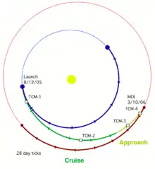 MRO cruised through interplanetary space for seven and a half months before reaching Mars. While en route, most of the scientific instruments and experiments were tested and calibrated. To ensure proper orbital insertion upon reaching Mars, four trajectory correction maneuvers were planned and a fifth emergency maneuver was discussed.[14] However, only three trajectory correction maneuvers were necessary, which saved 27 kilograms (60 lb) of fuel that would be usable during MRO's extended mission.[15]