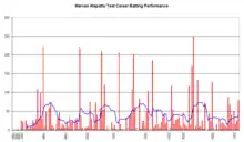 His highest Test score of 249 came against Zimbabwe in 2004 at Bulawayo.[15] His score of 127 in 2005 against New Zealand was his last Test century.[15] As of August 2015, Atapattu is sixth in the list of most double hundreds scored in Test matches.[16]