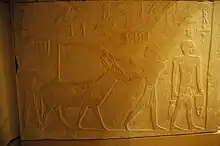 At the south door jamb, the delivery of an antelope is depicted on the south wall. Two men, wearing only kilts with three bands, bring the animal as an offering. The funerary priest Ankh-haf holds the antelope at the mouth and horns. The "leader of the hall" drives the animal forward with a stick. A man in front brings other offerings. The antelope is a donation from a property which provided materials for the funerary cult of Kaninisut. Above it are further images of offering gifts, arranged in two rows.[8]