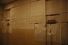The small south wall contains a list of offerings and a dining scene. The offering list consists of eight registers, in which the captions are arranged from left to right in short vertical columns without dividing lines. The dining scene is at the right hand side of the lower four registers. In the ritual offering lists, the offerings and ritual actions are noted, which were carried out in the regular funerary cult at the tomb. They begin with the list of the entrance rites, which were carried out by the funerary priest, like the purification of the cult space by sweeping and pouring water, washing hands, burning incense and supply of the seven holy oils and anointments. After this follows the list of foods and drinks which were to be brought in a defined order. These consist of various kinds of breads, cakes, meats, poultry, fruit and vegetables. Only fragments of the dining scene survive.[10]