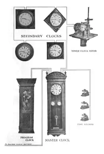 Diagram of electric time system used around 1910 to keep time in factories, schools, and other large institutions. The master clock (bottom center), controlled by a temperature-compensated mercury pendulum, is wired to slave clocks throughout the building. In addition to wall clocks, it also controls time stamps that are used to stamp documents with the time, and a turret clock used in a clock tower. The "program clock" is a timer that can be programmed with punched paper tape to ring bells or turn machines on and off at preprogrammed times.