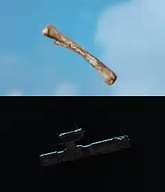 Stanley Kubrick's 1968 film 2001: A Space Odyssey contains a famous example of a match cut.[4][5] After a hominid discovers the use of bones as a tool and a weapon, he throws one triumphantly into the air. As the bone spins in the air, there is a match cut to a much more advanced tool: an orbiting satellite.[6] The match cut helps draw a connection between the two objects as exemplars of primitive and advanced tools respectively, and serves as a neat summary of humanity's technological advancement up to that point.[7] The satellite is unidentified in the film, but the novel makes it clear that it is an orbital weapon platform, thus linking with the use of the bone as a weapon.