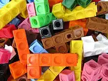 Mathematical manipulatives can be purchased or constructed by the teacher. Examples of common manipulatives include number lines, Cuisenaire rods; fraction strips,[1] blocks, or stacks; base ten blocks (also known as Dienes or multibase blocks); interlocking linking cubes (such as Unifix); construction sets (such as Polydron and Zometool); colored tiles or tangrams; pattern blocks; colored counting chips;[2] numicon tiles; chainable links; abaci such as "rekenreks", and geoboards. Improvised teacher-made manipulatives used in teaching place value include beans and bean sticks, or single popsicle sticks and bundles of ten popsicle sticks.