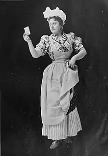 She became McCaull's leading comedian and wore many hats while with his company being a stage director, costume designer and, at times, handled the company's finances. McCaull made her a partner in the organization and musical comedy became her forte in the 1880s. In the 1890s and reaching her forties, Cottrelly settled into being a character actress which she remained for the rest of her career.[4] Her talent and versatility kept her in demand (more than 30 productions between 1895 and 1926) and while many of her roles called for German or Yiddish accents she also won critical praise for portrayals of French, Spanish, and Swedish characters.