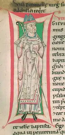Matilda was introduced by her mother to numerous personalities in church reform, especially Pope Gregory VII himself. She had already met the future Pope, then Archdeacon Hildebrand, in the 1060s. After his election as Pope, she met him for the first time during 9–17 March 1074.[49] With Matilda and Beatrice, the Pope developed a special relationship of trust in the period that followed. However, Beatrice died on 18 April 1076. On 27 August 1077 Matilda donated her town of Scanello and other estates to the extent of 600 mansus near the court to Bishop Landulf and the chapter of Pisa Cathedral as a soul device (Seelgerät) for herself and her parents.[37][50]